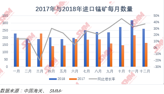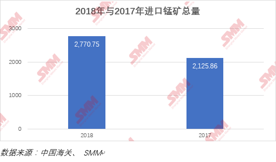 The total amount of manganese ore imported in 2018 was 27.7075 million tons, compared with 21.2586 million tons in 2017, an increase of 644.89 tons over the previous month, an increase of 30.33 percent, and the average monthly import volume increased by 537400 tons over the same period last year.