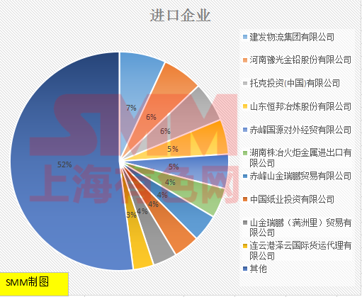 As can be seen from the pie chart of imported lead concentrate from January to December, Jianfa Logistics Group Co., Ltd. (7%), Henan Yuguang Gold and lead Co., Ltd. (6%), Tok Investment (China) Co., Ltd. (6%), Shandong Hengbang smelting Co., Ltd. (5%), Chifeng Guoyuan Foreign Trade Co., Ltd. (5%), Hunan Zhuye Torch Metal Import and Export Co., Ltd. (4%), Chifeng Mountain Jin Ruipeng Trading Co., Ltd. (4%) accounted for a relatively large number of imported lead concentrate.