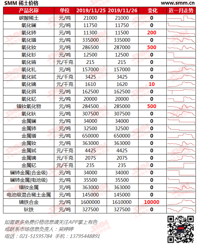 November 26 SMM rare earth spot price: dysprosium oxide up 10 yuan / kg - Shanghai Metals Market (SMM)