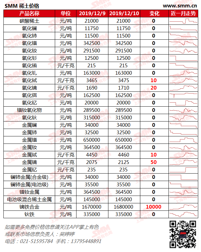 Dysprosium oxide and terbium oxide prices continued to rise today, rising to 170-1.72 million yuan / ton and 346-3.49 million yuan / ton respectively. Light rare earth prices today are more stable than yesterday, praseodymium and neodymium oxide quoted 28.8-291000 yuan / ton. Quotations from large factories remain strong. Downstream magnetic material enterprise inquiry situation is generally OK, the actual transaction atmosphere is generally weak, most of them are in a wait-and-see state. Limited by downstream demand, although dysprosium oxide prices continue to rise, but iron prices today further upside down to 167-1.69 million yuan / ton.