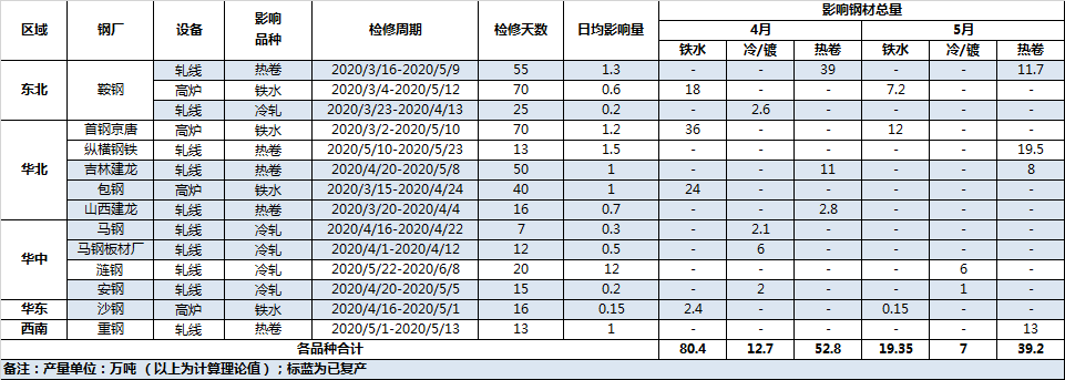 Maintenance and recovery increment: according to SMM statistics, the total increment of maintenance and recovery steel plant is about 250000 tons. Although the impact of the new maintenance is 325000 tons, but under the hedging of the new rolling line (vertical and horizontal steel mills put on the 1450mm hot rolling line in May), the impact is only about 150000 tons. Contributed to an increase in planned production in May.