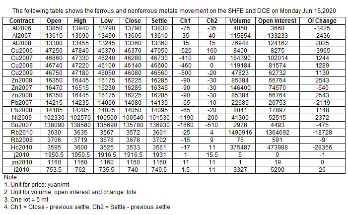 The following table shows the ferrous and nonferrous metals movement on the SHFE and DCE on June 15, 2020