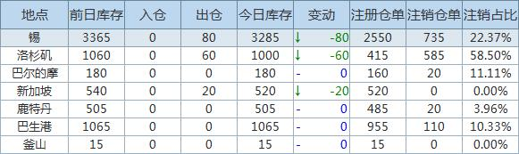 Tin inventory decreased by 80 tons and written-off warehouse receipts decreased by 6.96%.