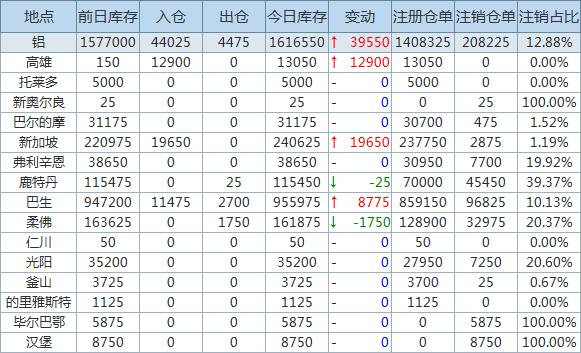 Aluminum inventories increased by 39550 tons, with the largest increase in warehouses in Asia