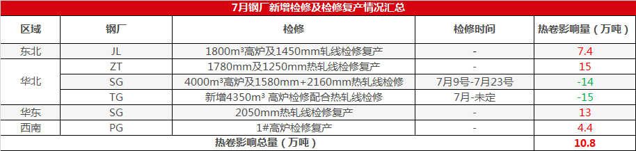 Increment of overhaul and resumption of production of steel mills: according to SMM statistics, the increase of overhaul and resumption of production of steel mills in July is about 398000 tons, while the amount of new overhaul affected by steel mills is about 290000 tons, and there is still an increase of about 108000 tons of hot coil after hedging, prompting the planned output of steel mills to increase in July.