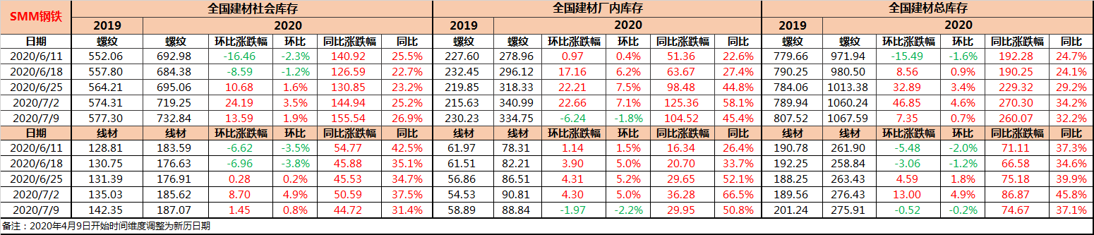 July 9, SMM7: this week, the threaded stock continued to accumulate under the continuous interference of seasonal precipitation, but due to the decline of production, the improvement of terminal demand due to the improvement of the epidemic in the north and the rain in the south, and the expected strength of the market, the rate of inventory accumulation slowed significantly this week. As of July 9, the total inventory of building materials nationwide was 10.6759 million tons, with a month-on-month ratio of + 0.7% and a year-on-year ratio of + 32.2%.