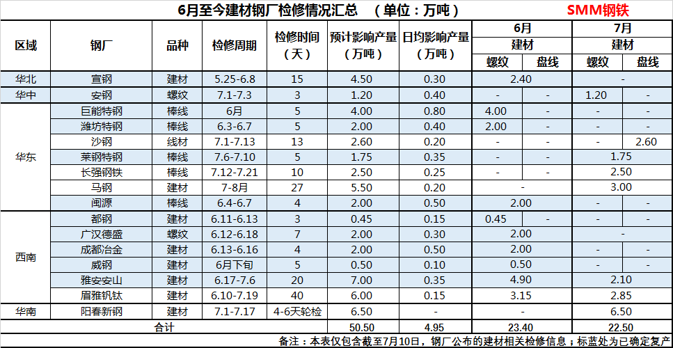 Table 2: overhaul of building materials in steel mills from June to July (in ten thousand tons)