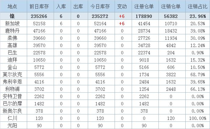 Nickel stocks increased by 6 tons, all from Singapore warehouses.