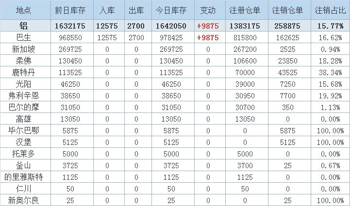 Aluminum inventory increased by 9875 tons, all from Klang warehouse