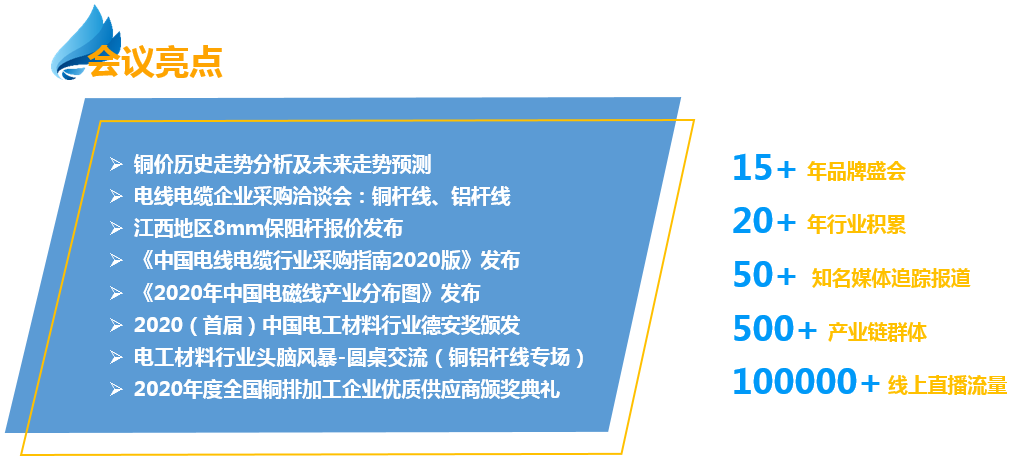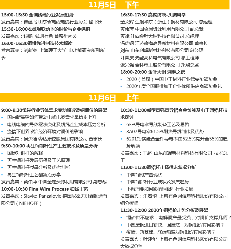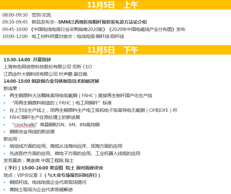 SMM11: November 5th, jointly sponsored by SMM (SMM) and Jinye Big Copper, the 2020 (Fifth) China Electrical Materials supply and demand Trade Summit, jointly organized by Shanghai Nonferrous Metals Industry Association, Zhejiang Electric Wire and Cable Industry Association and Huzhou Electrical Appliance Industry Chamber of Commerce, will be held at Binjiang Tianjie Holiday Inn, Longhu, Hangzhou, Zhejiang Province. This meeting received full support from Hongqi Group Jiangxi Copper Co., Ltd., Dongfang Group products Co., Ltd., Jiangsu Xinhai High conducting New Materials Co., Ltd., Zhejiang Jiuli Electric Materials Co., Ltd., Germany Nihov Machinery Manufacturing Co., Ltd., etc.