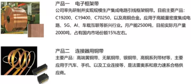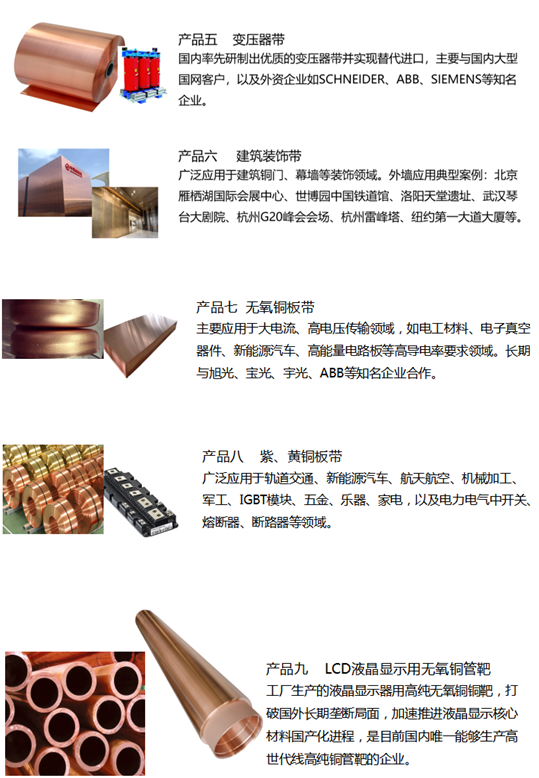Copper-copper alloy plate and strip production line: the plate and strip production line is equipped with first-class equipment and advanced technology, with an annual output capacity of 150000 tons. It has several high-precision electronic copper strip production lines, which can cover national standard, American standard, Japanese standard, European standard, German standard, industry standard and higher-than-standard customized products. The highest controllable precision of the product is + /-0.003mm.