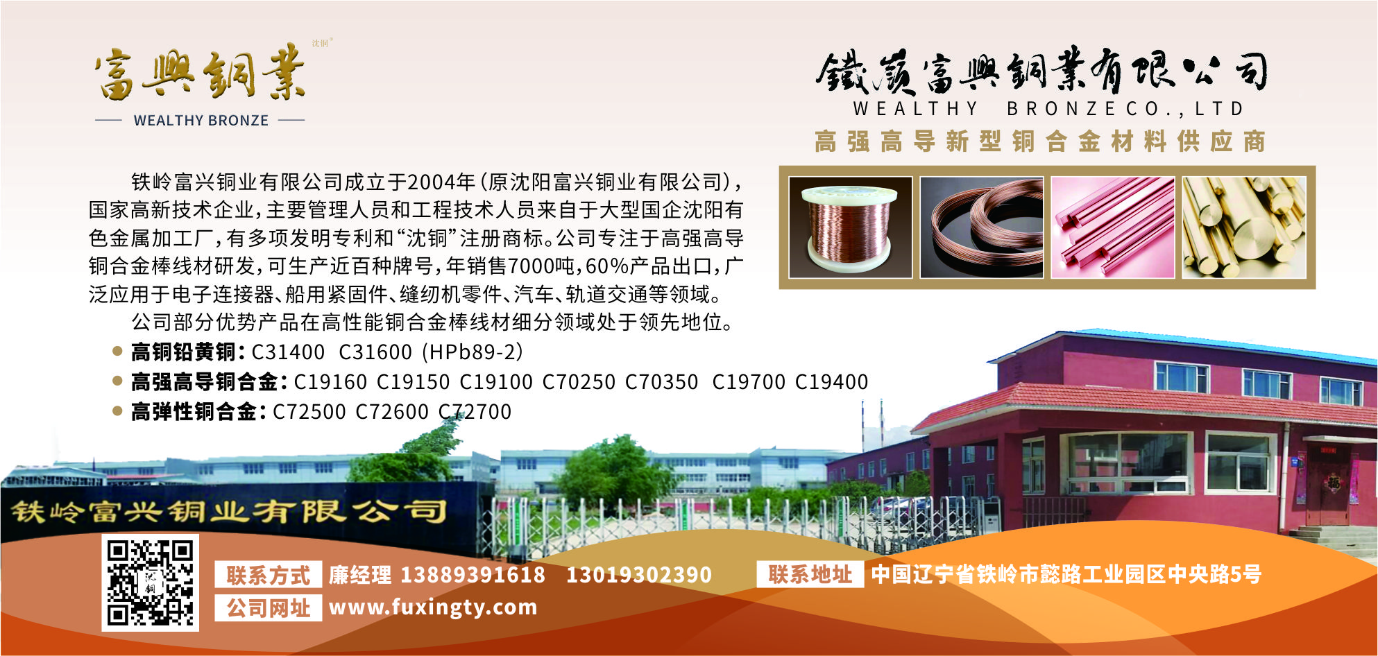 Tieling Fuxing Copper Co., Ltd. (formerly Shenyang Fuxing Copper Co., Ltd.), founded in 2004, is located in Tieling City, Liaoning Province. The main managers and engineers of the company come from Shenyang Nonferrous Metal processing Plant, a large state-owned enterprise. The company is a national high-tech enterprise with a number of invention patents and "Shenyang Copper" registered trademark. Focus on high-strength and high-conductivity copper alloy rods and wires, can produce nearly 100 brands, annual production and sales of 7000 tons, 60% of the products are exported.