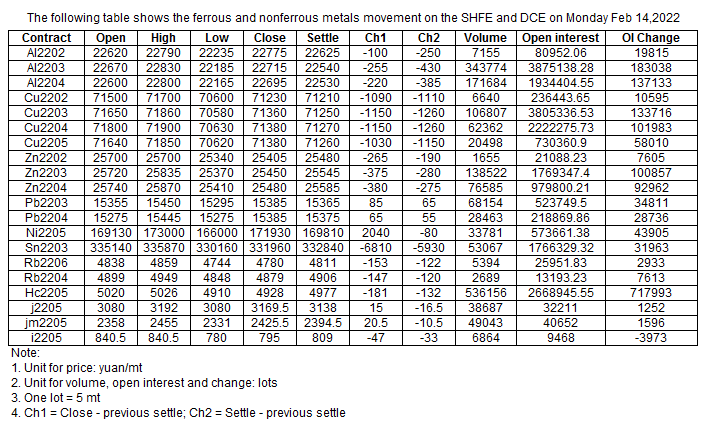 The following table shows the ferrous and nonferrous metals movement on the SHFE and DCE on February 14, 2022
