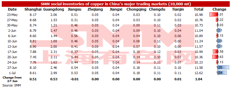 SHANGHAI, Jul 1 (SMM) - As of Friday July 1, SMM copper inventory across major Chinese markets increased by 10,400 mt from Monday to 126,200 mt, up by 23,900 mt from last Friday. Compared with Monday's data, the inventories across China increased. The total inventory dropped by 106,500 mt compared with the same period last year when the inventory was recorded at 232,700 mt. Among them, the inventory in Guangdong dropped by 60,000 mt, the inventory in Shanghai dipped by 26,400 mt, and the inventory in Jiangsu fell by 14,000 mt. The increase in inventory this week is contributed by, first of all, smelters actively ship goods to the warehouses to relieve their inventory pressure approaching the mid-year. Secondly, downstream funds are tight and they are unwilling to make excessive restock amid falling copper prices. Thirdly, the imported copper continuously flows into the domestic market.