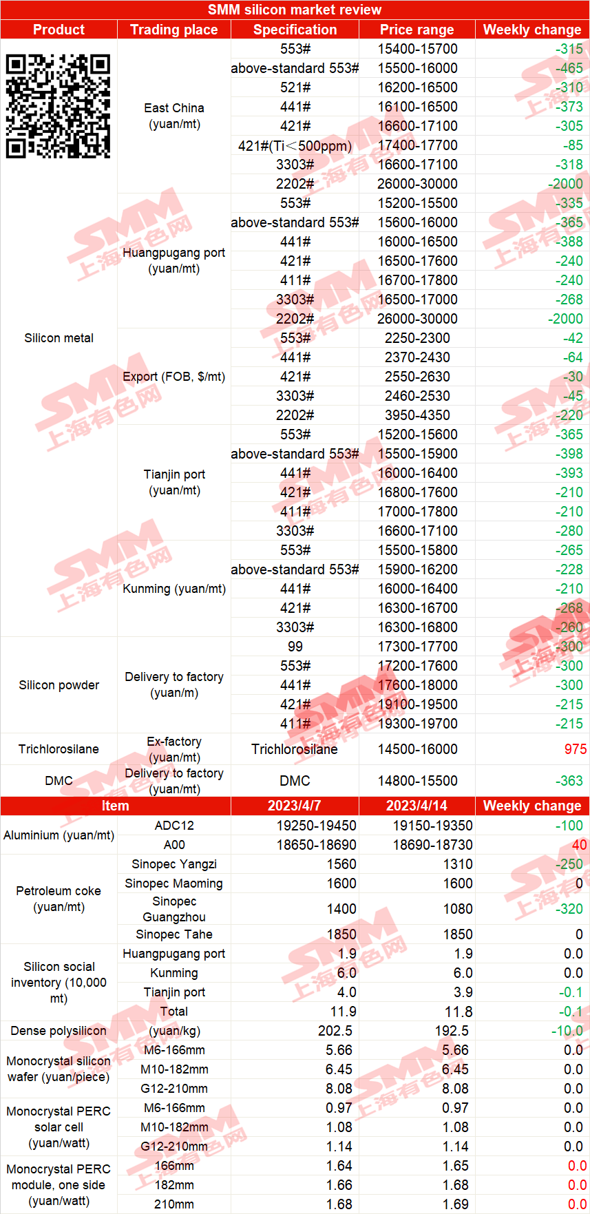 SHANGHAI, Apr 14 (SMM) - Silicon metal prices fell slightly this week. As of April 13, the prices of above-standard #553 silicon metal in east China lost 250 yuan/mt from a week earlier to 15,500-15,700 yuan/mt, those of #441 silicon metal dropped 150 yuan/mt to 16,100-16,300 yuan/mt, those of #421 silicon metal (used in silicone) dipped 150 yuan/mt to 17,400-17,500 yuan/mt and those of #3303 silicon metal fell 250 yuan/mt to 16,600-16,900 yuan/mt. Silicon metal prices continued to fall amid weak market sentiment. Silicon factories in south and north China suffered losses to varying degrees. In Xinjiang, electricity costs of silicon enterprises diverged and the profits of a small number of companies with high electricity costs were extremely low. Poor profits, coupled with the poor shipments and high inventory, caused enterprises to stop production. Under the high costs, silicon enterprises were unwilling to ship at low prices and the prices of low-grade silicon metal stabilised.