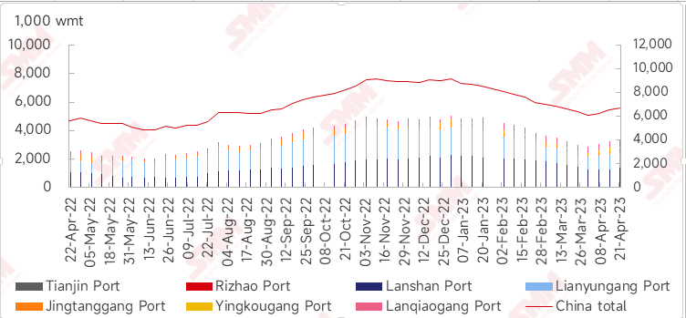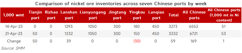 SHANGHAI, Apr 23 (SMM) - As of April 21, port inventories of nickel ore in China stood at 6.72 million wmt, up 169,000 wmt WoW. The total Ni content was 53,000 mt. The port inventory across seven major Chinese ports totalled 3.33 million wmt, 59,000 wmt higher than the previous week. NPI prices rose to 1,100 yuan/mt on stable ore prices, which encouraged downstream purchases but suppressed the traders' willingness to ship spots. The port inventory may maintain an upward track in the near future.
