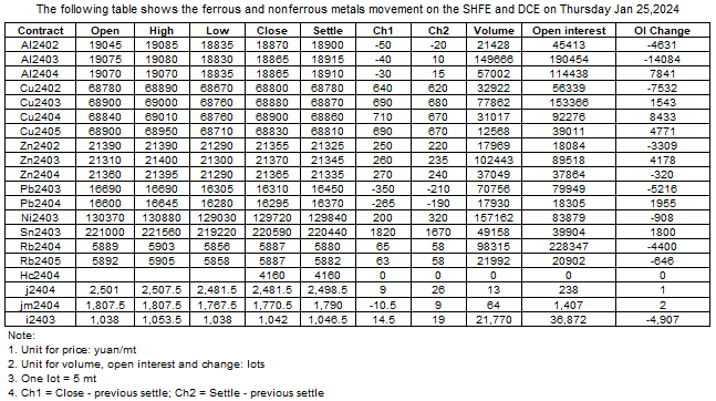 The following table shows the ferrous and nonferrous metals movement on the SHFE and DCE on Jan 25, 2024