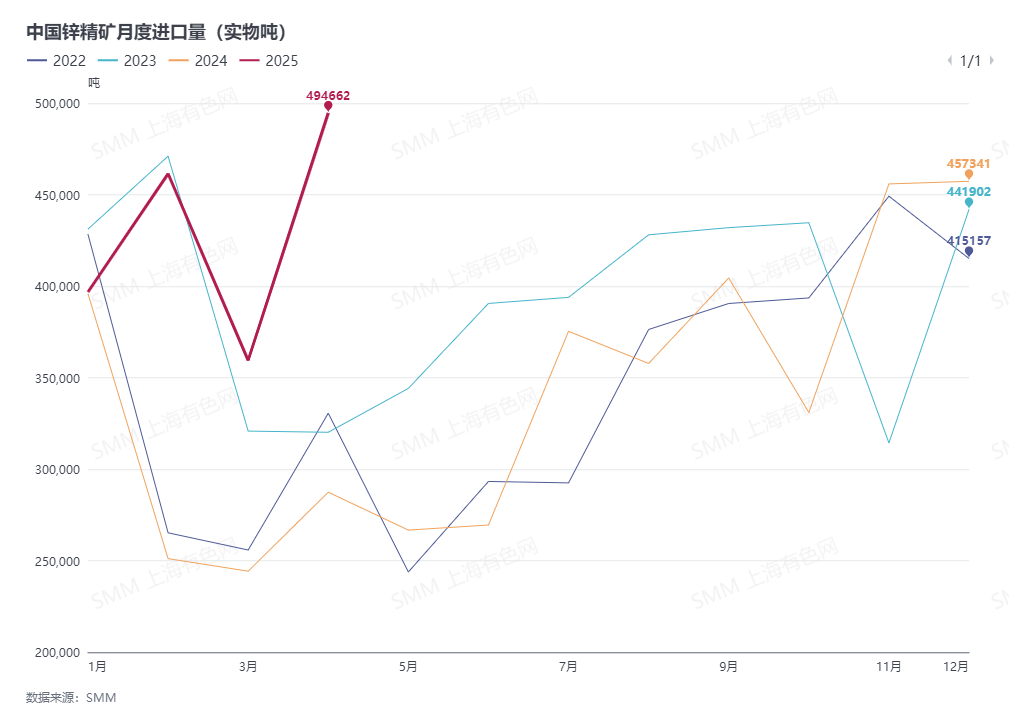 According to the latest customs data, China imported 494,700 mt (metric tons) of zinc concentrates in April 2025, up 37.6% MoM (135,200 mt) and 72.07% YoY. The cumulative imports of zinc concentrates from January to April 2025 reached 1.7125 million mt, up 45.26% YoY.