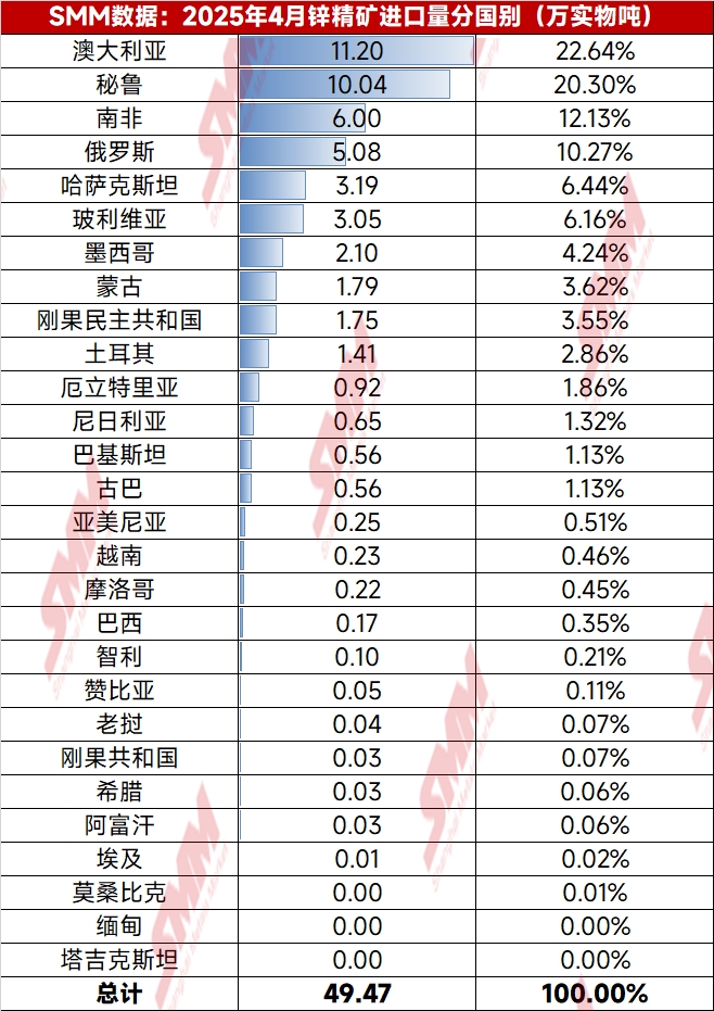 By country, the top three sources of imported zinc concentrates in April 2025 were: Australia with 112,000 mt, accounting for 22.64%; Peru with 100,400 mt, accounting for 20.3%; and South Africa with 60,000 mt, accounting for 12.13%. On a MoM basis, countries such as Australia, South Africa, Russia, Peru, and Bolivia saw significant increases in imports, while imports from countries like Eritrea, Turkey, and Pakistan decreased to varying degrees.
