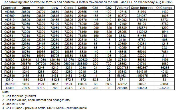 The following table shows the ferrous and nonferrous metals movement on the SHFE and DCE on 06 Aug, 2025