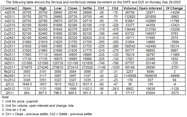 The following table shows the ferrous and nonferrous metals movement on the SHFE and DCE on 29 Sep , 2025