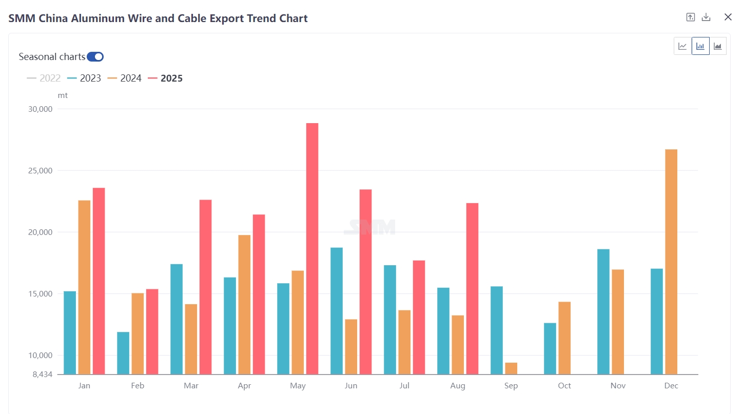 SMM Brief Comment: China's aluminum wire and cable exports are expected to maintain a stable-to-rising trend in Q4 2025. On one hand, benefiting from the accelerated global energy transition, new energy grid connection projects in Southeast Asia continue to increase, coupled with grid upgrade demand in emerging markets such as Africa and Latin America, which will continue to support exports of key products like steel-core aluminum stranded wire. On the other hand, the front-load order effect triggered by adjustments in China's PV module export policies is expected to become apparent in September-October. Full-year exports are projected to be in the range of 200,000-250,000 mt, and due to overseas PV project construction demand, the product structure may shift toward aluminum alloy cables in the short term.