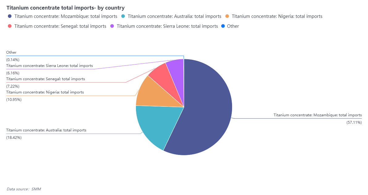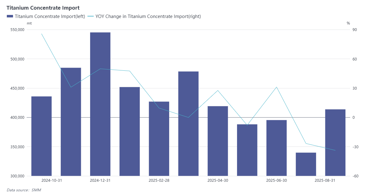 According to the latest customs data, China's titanium concentrate imports reached 413,000 tons in August 2025, a month-on-month increase of 21.76%, but still a year-on-year decrease of 33.82%; cumulative imports from January to August were 3.317 million tons, a cumulative slight decrease of 0.1% year-on-year. In terms of source countries, imports were mainly concentrated in Africa, with Mozambique being the largest supplier, importing 214,000 tons in a single month, Nigeria importing 23,000 tons, and Australia importing 41,000 tons. Although the import volume rebounded month-on-month in August, reflecting some restocking demand, the significant year-on-year decline and the weakness in cumulative data still indicate that domestic terminal demand remains generally weak, and market supply pressure has not been effectively alleviated.