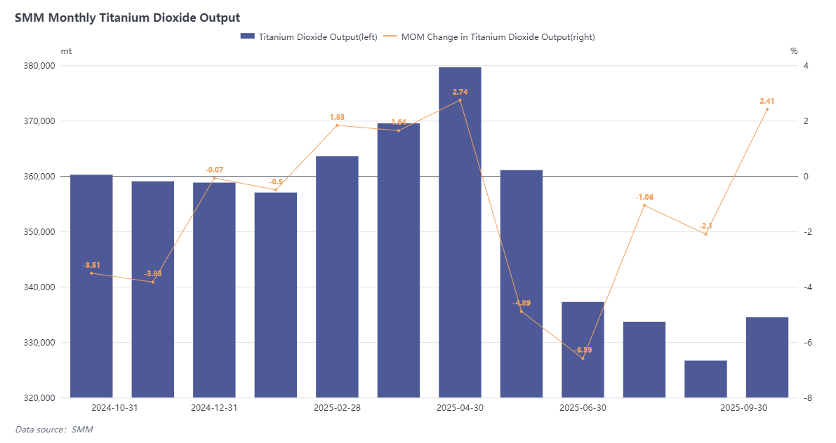According to SMM data, China's titanium dioxide production was 334,500 tons in September 2025, a month-on-month increase of 2.41%. Market demand was strong this month, transaction volume increased significantly, corporate destocking effects were obvious, and overall inventory decreased by 14.03% month-on-month.