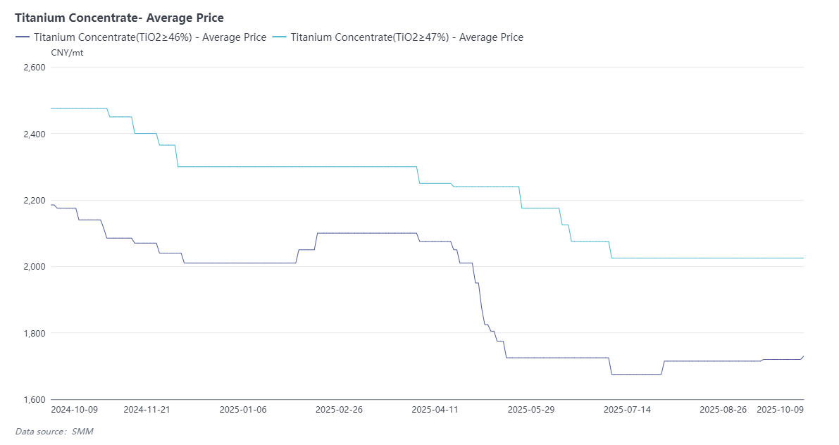 In September, the quotation range for domestic titanium concentrate (TiO₂ ≥ 46%) was 1680-1760 yuan/ton, with an average price of 1730 yuan/ton; the quotation range for TiO₂ ≥ 47% specification was 1950-2100 yuan/ton, with an average price of 2025 yuan/ton. Titanium concentrate prices overall maintained stable operation, but the trend was weak. Although influenced by the recovery in downstream titanium dioxide market demand in September, prices experienced a slight increase, the overall market did not show a significant seasonal upward trend and remained in a state of high fluctuation. The main reason is persistently weak terminal demand, which failed to effectively boost the market even during the traditional peak season "Golden September". It is expected that titanium concentrate prices will continue their weak and stable trend in October.
