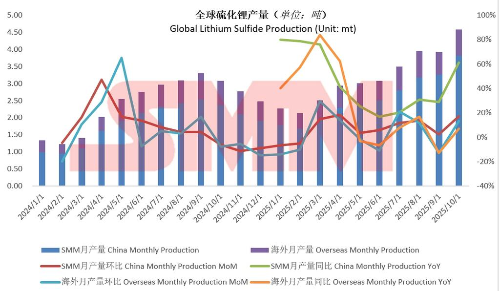 Highlights: In September 2025, global lithium sulfide production increased domestically but decreased overseas, with China up 2.52% MoM while overseas production fell sharply by 12.99%. A strong rebound is expected in October, driven primarily by domestic capacity ramp-up. The industry faces both high growth and batch stability challenges.