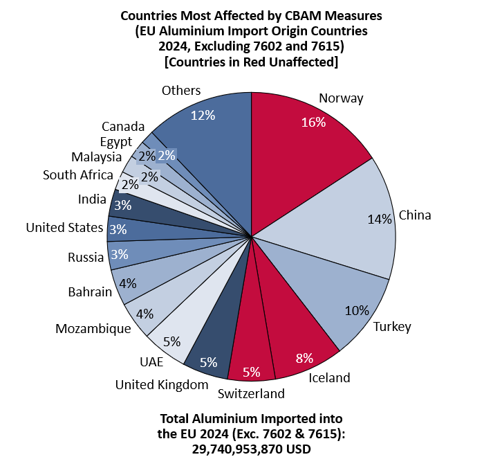 However, exporters of aluminium to the EU, excluding scrap aluminium and highly processed products, will face the greatest challenges once CBAM payments begin in 2026. Based on 2024 aluminium export data (excluding HS 7602 and 7615), Norway, Iceland, and Switzerland account for 29% of the EU’s total aluminium import value in USD in 2024, but they are unaffected by CBAM pricing.