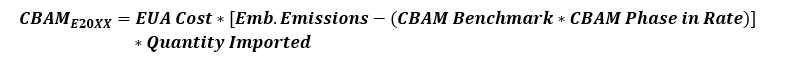 For goods within the CBAM scope, EU importers must purchase certificates corresponding to their carbon intensity relative to the CBAM benchmark for each HS code. The CBAM cost is calculated as follows: