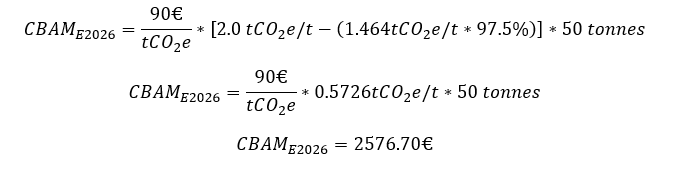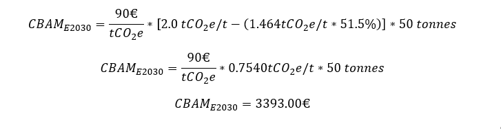 An import of 50 tonnes of unwrought aluminium HS7601, with 2.0 tCO2e/t, and an estimated EUA cost of 90€ per tCO2e/t would be calculated as follows: