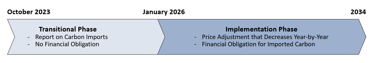 From 2025 to 2034, the CBAM will go through its initial implementation phase, where businesses are required to pay based upon carbon emission values of their imports. From 2026 to 2034, there will be adjustments to the carbon pricing, which act functionally as reductions of payments which are highest in 2026 (meaning you pay the least in 2026). Annually, this payment adjustment gets lowered, up until 2034 where there will be no adjustments to the carbon pricing, and businesses have to bear the full burden of any carbon imports that they make.