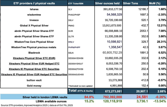 As a large amount of spot silver is linked to ETFs and cannot circulate freely in the market, traders on Twitter have shared estimates that the freely circulating silver in the London market is less than 4,000 mt. The SLV prospectus mentions that custody can be in warehouses in the UK or New York, but given the London market's focus on spot trading and New York's emphasis on futures trading, it is generally assumed that SLV's primary physical holdings are in London warehouses.