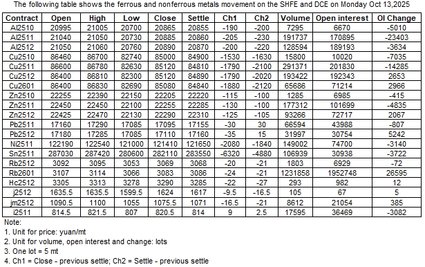The following table shows the ferrous and nonferrous metals movement on the SHFE and DCE on 13 Oct , 2025