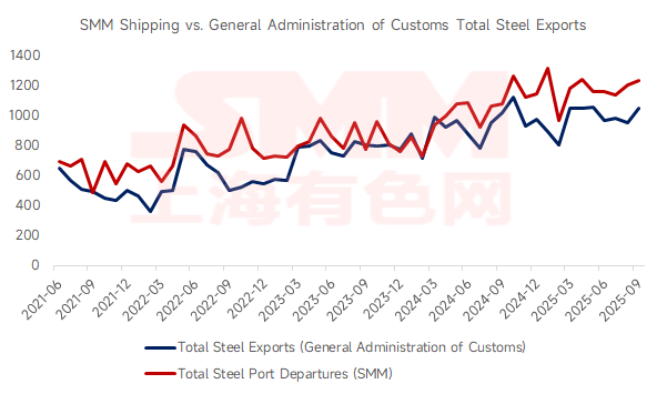 According to the latest steel mill export order schedules from SMM, hot-rolled coil export plans for October increased by 8.4% MoM compared to the actual export volume in September. This was mainly due to improved export orders at some major mills following the earlier escalation of export fraud investigations in MD, combined with the expansion of Chinese steel mills' global sales channels, improved product quality, and enhanced overseas recognition since the beginning of the year. According to SMM shipping data, as of September 30, China's total steel product port departures in September reached 12.3042 million mt, up 2.17% MoM from August. Overall, due to the earlier factor of forging documents to meet shipping schedules, the volume of such documents relatively declined this month. However, considering that procurement demand received by steel mills increased in the past two months, SMM predicts that October exports will decline MoM, but the decrease may be limited. Meanwhile, regarding the widely noticed "Announcement on Optimizing Matters Related to Enterprise Income Tax Prepayment Declarations" effective from October 1, SMM survey indicates that no new implementation progress has been reported at northern ports so far, and quotes for forged documents seem to be re-emerging. In southern ports, due to more cumbersome procedures, tax-included exports remain dominant for now. SMM will continue to track further developments.
