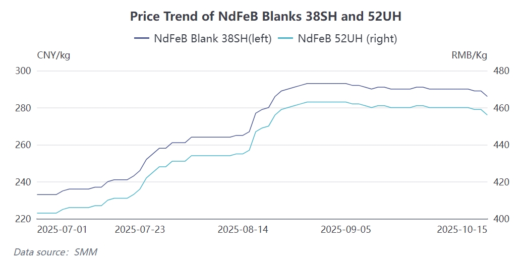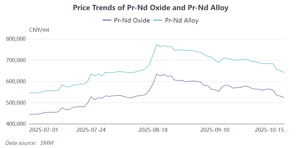 According to the latest SMM survey, China's NdFeB magnetic material production in September 2025 was 29,106 mt, down 1.66% MoM, with the overall industry operating rate at 68.1%, down 4.14 percentage points MoM. More critically, October production is expected to further decline to 27,648 mt, down approximately 5% MoM, reflecting the multiple pressures currently facing the magnetic material industry. Based on this, the NdFeB market price in October is expected to decrease by about 3.4% MoM compared to September, with the average price of the mainstream grade 52UH expected to be around 445 yuan/kg, while 48SH hovers near 300 yuan/kg. From a cost-plus perspective, the current actual transaction price corresponds to a Pr-Nd alloy price of about 650,000 yuan/mt, while the newly signed order quotes this week correspond to a level of 630,000 yuan/mt.