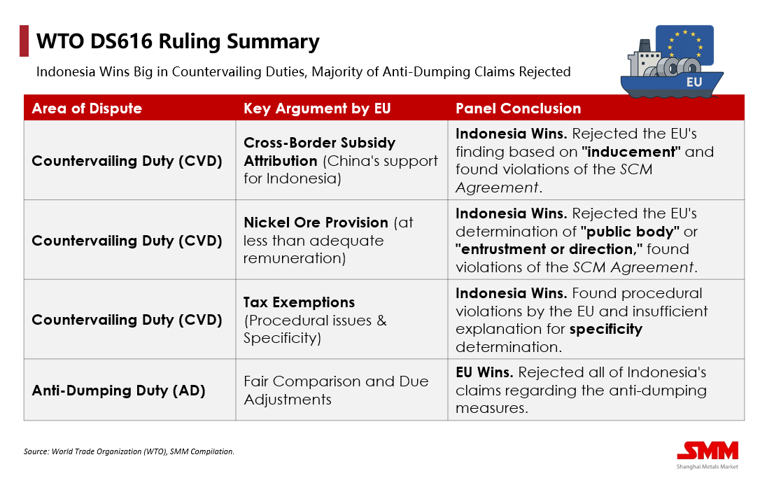 The WTO ruling theoretically removes the primary "policy handbrake" by rejecting the dominant 21.4% anti-subsidy duty, opening a potential path for nickel downstream products to re-enter the European market.