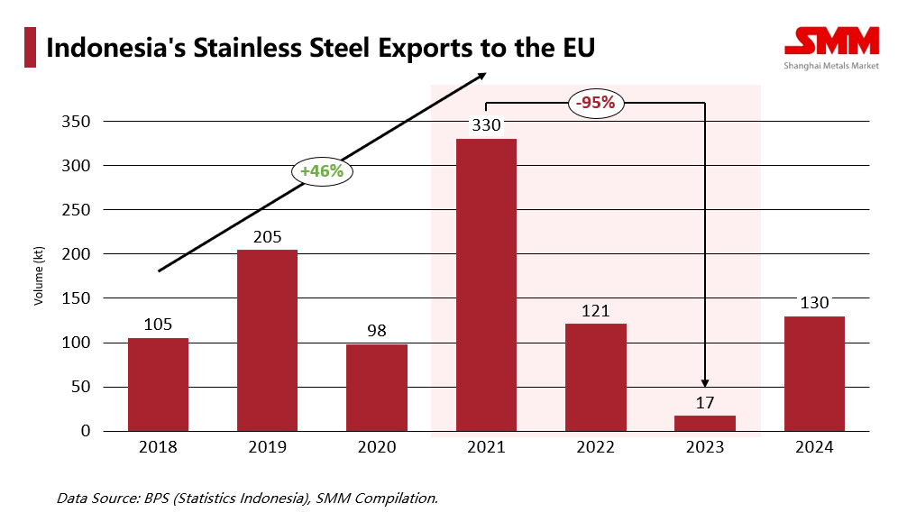 Under the combined impact of the EU's safeguard measures and the "double-duties" (anti-dumping/anti-subsidy), Indonesian stainless steel exports to the EU plummeted to a trough of just 17,100 tonnes in 2023. Even with a rebound in 2024, volumes remain at only about 39% of the 2021 peak (330,000 tonnes).