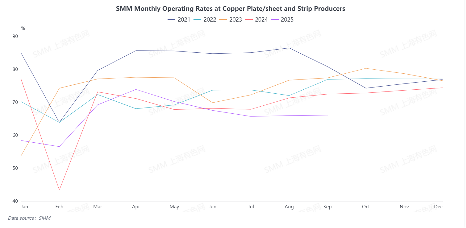 Looking ahead to the copper plate/sheet and strip market in October, although seasonally October remains within the traditional peak period, comprehensive analysis suggests that industry recovery momentum may still be insufficient. Key constraints focus on two aspects: first, the suppressive effect of high copper prices on end-use demand is expected to persist. If copper prices continue to fluctuate at highs, most enterprises have expressed clear concerns over October order volumes and are wary of the expected peak-season order growth—downstream enterprises, facing high procurement costs, are likely to continue controlling raw material procurement volumes, significantly limiting overall order growth potential. Second, during the National Day holiday, most copper plate/sheet and strip enterprises adjusted production schedules, slowing the production pace, which will weigh on the October operating rate. According to SMM's understanding of enterprise production schedules, most companies currently hold a "cautiously optimistic" view of the October market. The operating rate for copper plate/sheet and strip enterprises in October is projected at only 75.11%, down 0.91 percentage points MoM and down 7.62 percentage points YoY, with the year-on-year gap further widening.