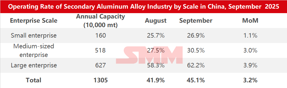 Survey Data on Operating Rates of Secondary Aluminum Alloy Enterprises by Region and Scale in October 2025:
