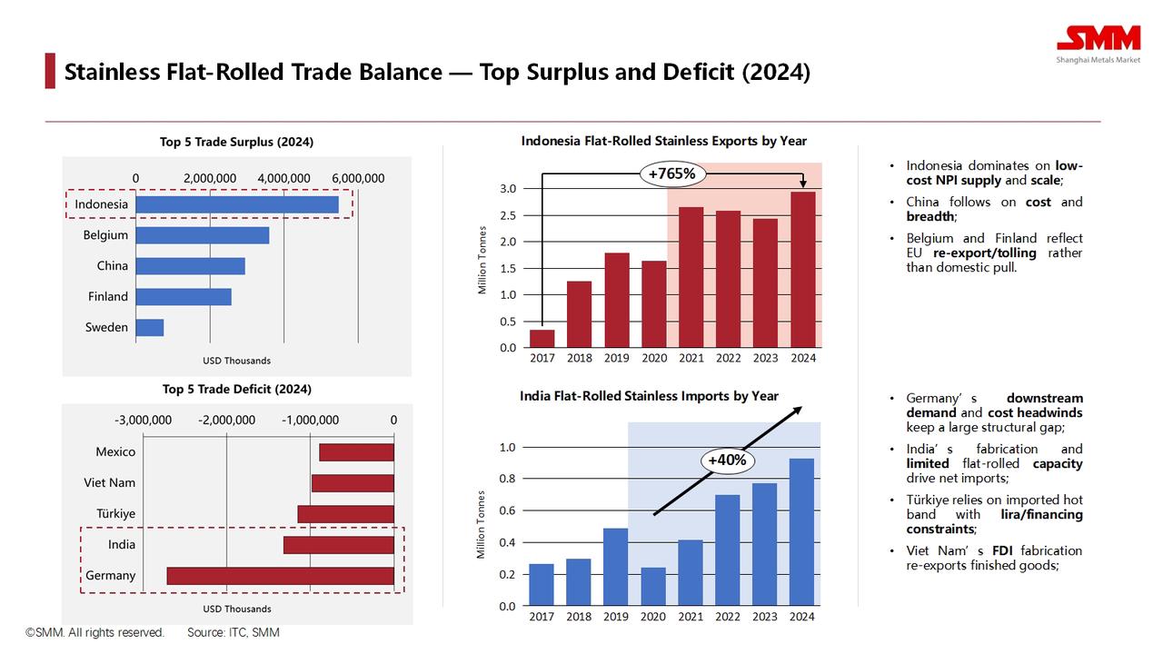 Trade data reveals a clear global imbalance. Leveraging its low costs and massive scale, Indonesia stands as the world's largest net exporter of stainless flat-rolled products by a significant margin. China follows as the second-largest. On the deficit side, Germany has the largest structural trade deficit, driven by strong downstream demand and high domestic production costs, while India and Turkey are also major net importers to feed their domestic manufacturing sectors.