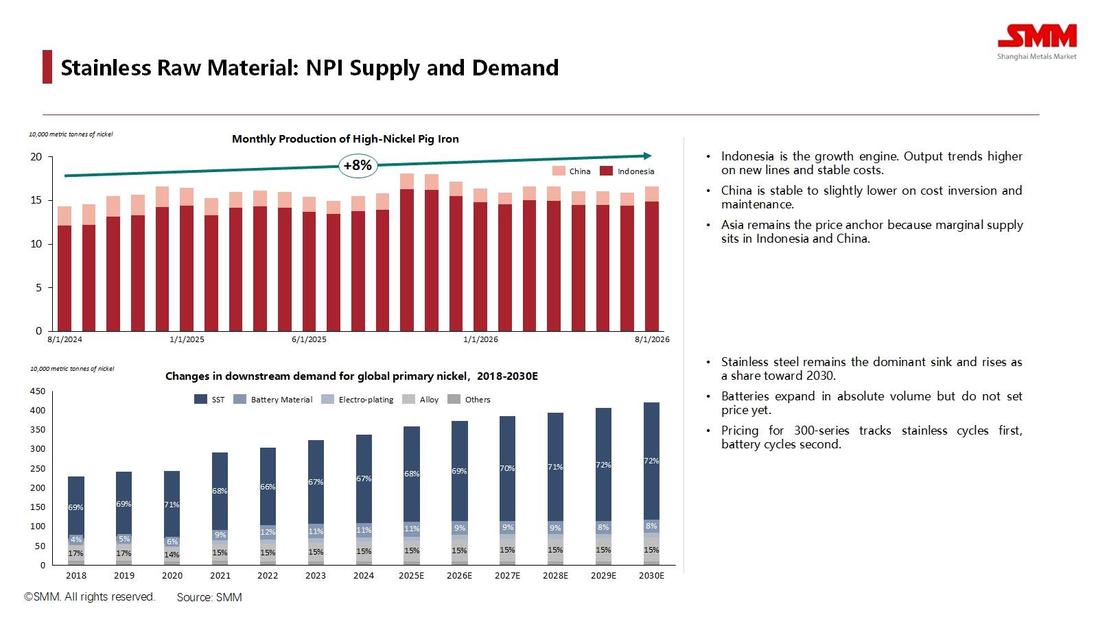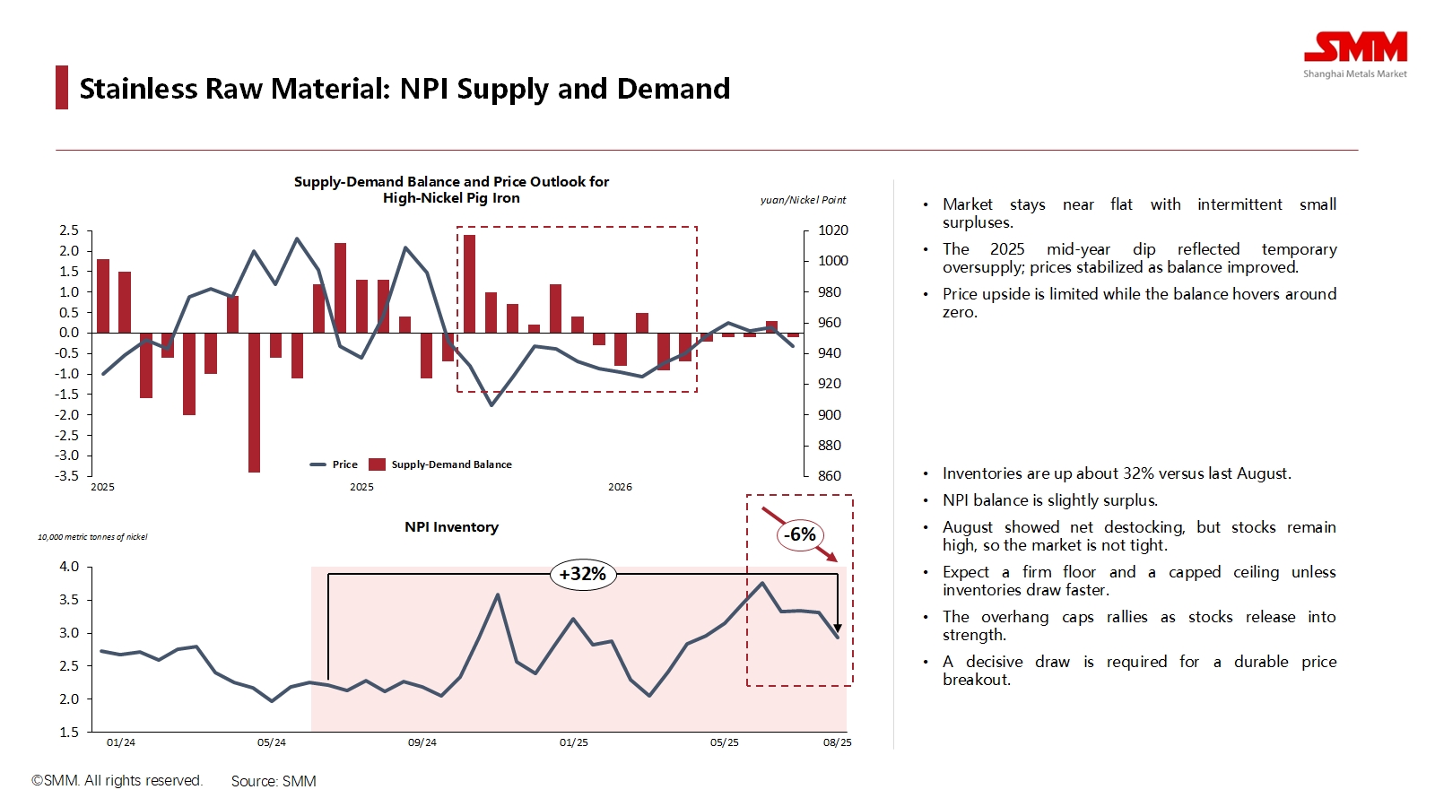 Despite supply growth, SMM forecasts that the NPI market will remain in a tight balance through 2026, with supply and demand largely matched, punctuated by occasional small surpluses. This balanced state limits the potential for significant price upside. Furthermore, a substantial inventory overhang—with stocks approximately 32% higher than the previous August—is capping prices. Any upward price momentum would likely be met by the release of these inventories, thus inhibiting a sustained rally.