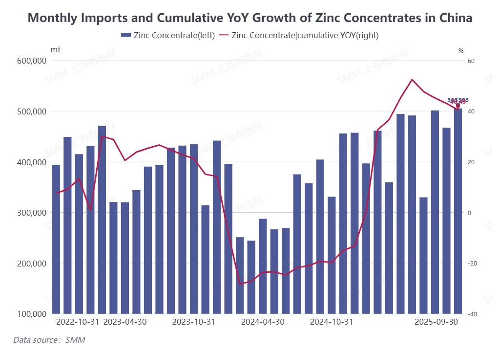 According to the latest customs data, zinc concentrate imports in September 2025 reached 505,400 mt (in physical content), up 8.15% MoM from August (an increase of 38,000 mt in physical terms) and up 24.94% YoY. Cumulative zinc concentrate imports for January-September totaled 4.008 million mt (in physical content), up 40.49% YoY.