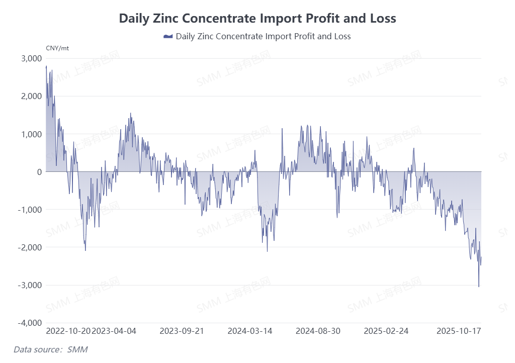 Entering October, considering seasonal reductions in mine output in Q4 and continued strong smelting production driven by margins, demand for zinc concentrate remains high. However, import losses for zinc concentrate widened further in October compared to September. Domestic smelters are actively sourcing domestic ore rather than imports, and overall spot order activity for imported zinc concentrate is sluggish. October import volumes are expected to have limited room for further increase.