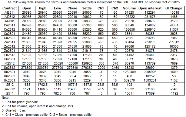 The following table shows the ferrous and nonferrous metals movement on the SHFE and DCE on 20 Oct , 2025