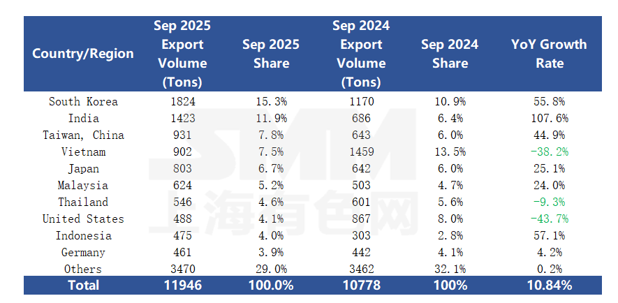 Customs data shows that in September, China's copper plate/sheet and strip exports continued to expand, reaching 85 countries and regions. In terms of specific export performance, the top markets for copper plate/sheet and strip exports that month showed significant divergence: South Korea and India stood out, ranking first and second with exports of 1,824 mt and 1,423 mt, respectively, and both recorded substantial YoY growth in export volume (55.8% and 107.6%), becoming key growth drivers for copper plate/sheet and strip exports that month. Meanwhile, the Vietnam and US markets were under pressure, with exports of 902 mt and 488 mt, respectively, showing significant YoY declines (38.2% and 43.7%), indicating relatively subdued export performance.