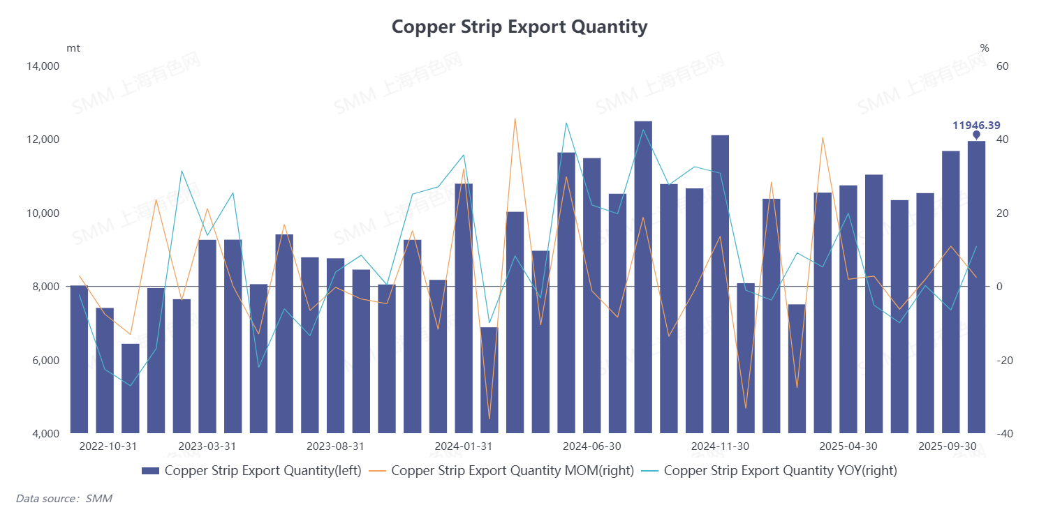 According to data from the General Administration of Customs, China's exports of copper plate/sheet and strip in September 2025 reached 11,946.39 mt, up 2.32% MoM and up 10.84% YoY. From January to September, cumulative exports of copper plate/sheet and strip totaled 94,692.13 mt, with a cumulative increase of 1.22% YoY.