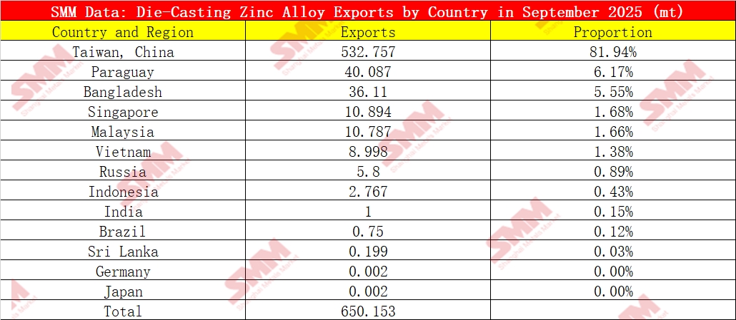 In September, the top three export destinations for China's unwrought zinc alloy were Taiwan, China (532.757 mt, 81.94%), Paraguay (40.087 mt, 6.17%), and Bangladesh (36.11 mt, 5.55%). After importing 532.422 mt in August, Taiwan, China imported 532.757 mt again in September, indicating sustained and stable local demand.